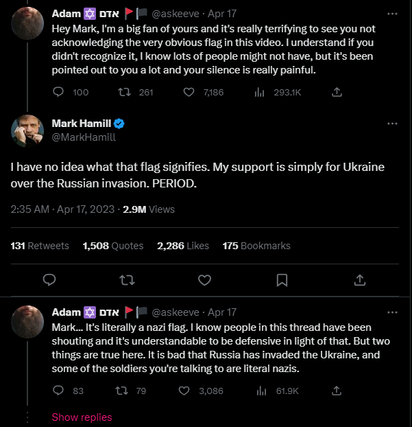 The unit’s use of Nazi symbolism became notable when actor Mark Hamill was filmed talking with soldiers of the unit, alongside other Ukrainian figures, the battalion displayed a Black Sun with a Tyr rune (a Pagan rune symbol used by the SS) on a flag: