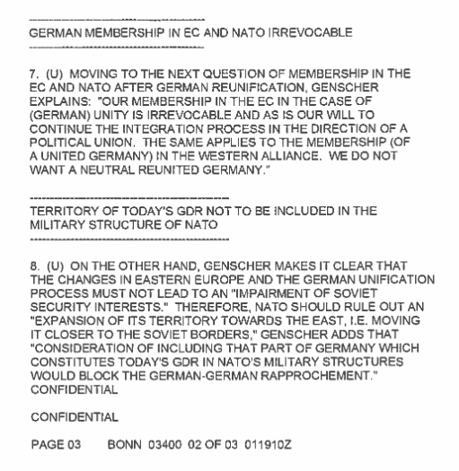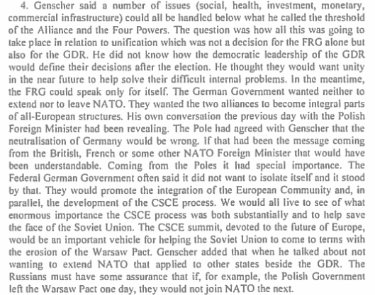 Take this one for example, where Vice Chancellor and Foreign Affairs Minister of West Germany, Hans-Dietrich Genscher, explains in a speech that NATO should not be moving closer to the Soviet borders, as this would be an “impairment of Soviet security interests”,