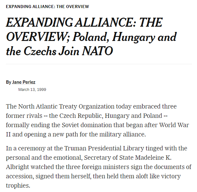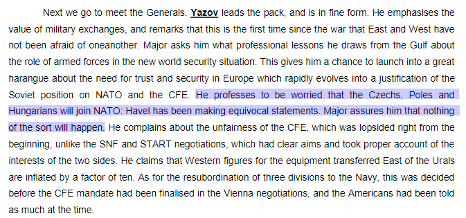 Baker can also be found noting that the Soviet leadership was opposed to any extension of the “NATO zone”, and of course we can refer back to the conversation between Yazov and John Major, Yazov named specific countries in Eastern Europe he feared could join NATO, and was assured this wouldn’t happen, all of the named countries later did.