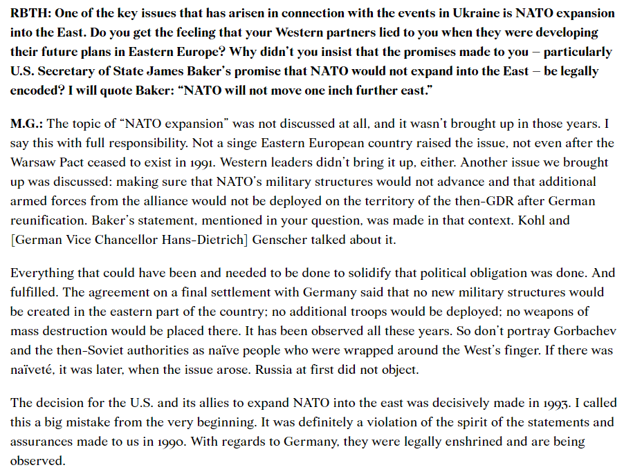 And a quote from Gorbachev claiming “the topic of Nato expansion was never discussed”, you can find these points in major media outlets and even NATO itself.