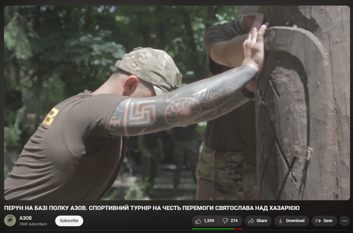 Azov’s official YouTube channel is still displaying Black Sun and Wolfsangel logos, and showcasing Biletsky at Azov rallies in uniform alongside soldiers brandishing Wolfsangel and Black Sun shields, on this channel you can also find clips showing figures with swastika tattoos that they only sometimes even bother to try and hide.