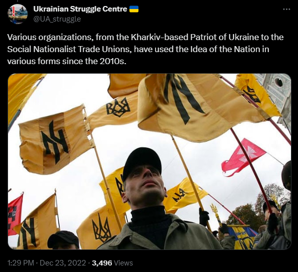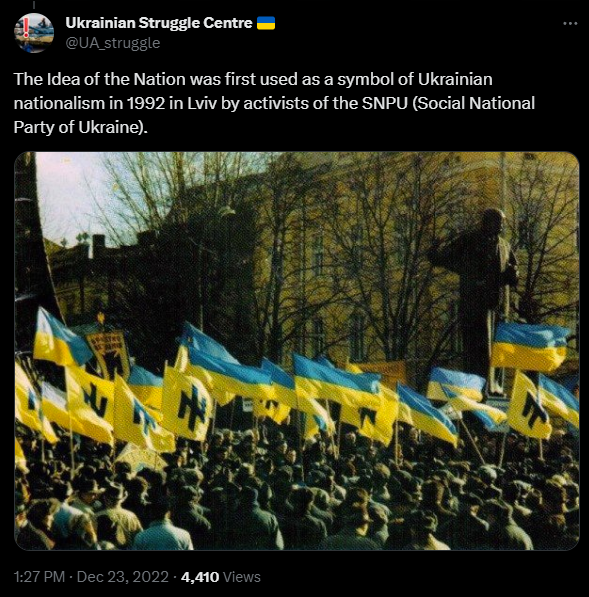 But when we see the symbol being used in Ukraine by these far-right groups, the inspiration is obviously quite different, it’s the same sort of contrast as seeing a Swastika in a Hindu temple vs seeing one used at a Neo-Nazi rally, one really is a marker of ancient history, the other is a sign of Nazism, when we consider the Neo-Nazi background of the “Social-Nationalists”, it becomes quite clear what side the “National Idea” is on.