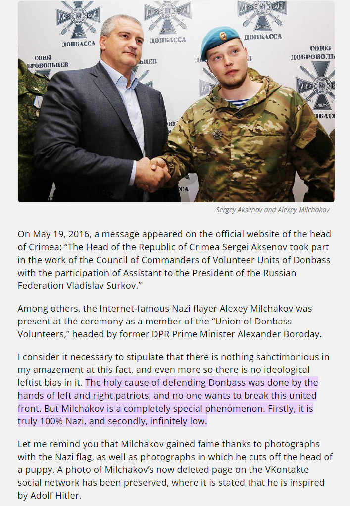 For example, one Pro-Russian publication complained back in 2016 that Milchakov had been granted an audience with Sergey Aksenov, the Russian governor of Crimea, complaining that the “holy cause” in Donbas was being damaged by the endorsement of someone who was “100% Nazi” and “inspired by Adolf Hitler”.