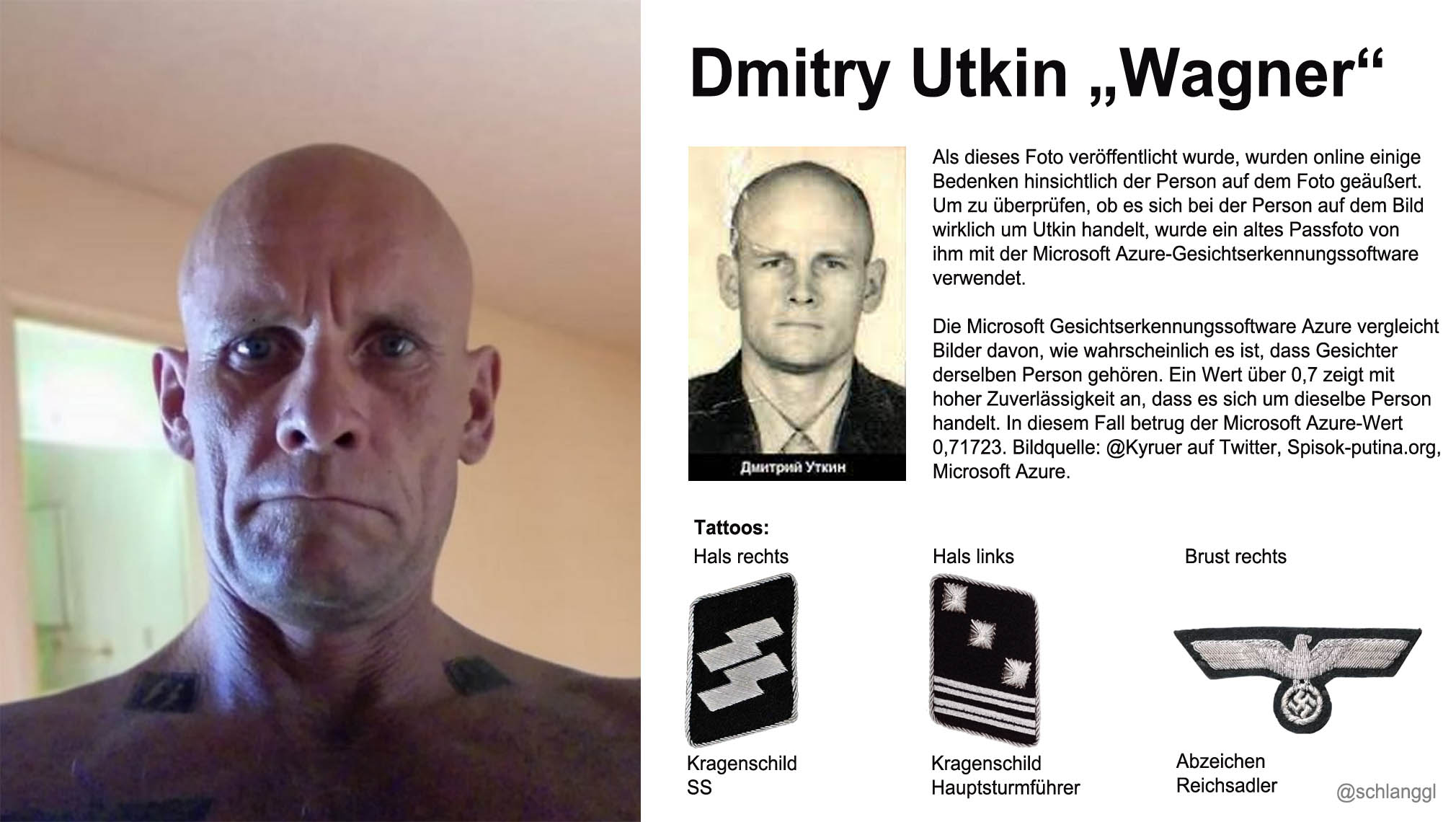 Wagner’s founder, Dmitry Utkin, is rather infamous, and it’s easy to see why, if you search up his name you’ll quickly come across pictures of him bare chested where his tattoos are easily spotted, he apparently decided to ink himself up with an SS Hauptsturmführer rank insignia, as well as the national emblem of the Third Reich, the Reichsadler, according to Bellingcat, even the name of the Wagner Group is a reference to Nazism.