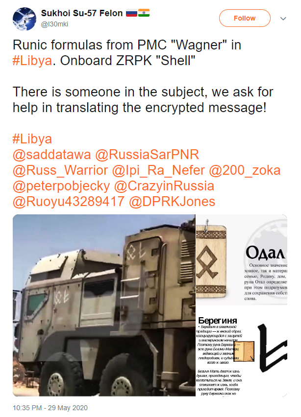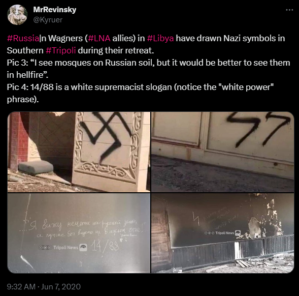 Just in case that wasn’t clear enough, when the Wagner Group was involved in combat in Libya fighting for warlord Khalifa Haftar, they decorated their surroundings with Nazi symbols, Anti-Muslim slogans and Germanic Pagan runes.