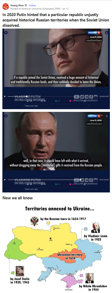 Distorting history, claiming that Ukraine only is what it is today thanks to ever so benevolent Russian leaders, and that the Russian leaders of today have a right to revoke these Russian “gifts” as they please.