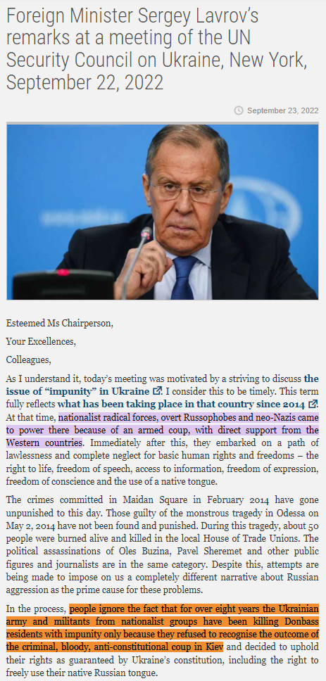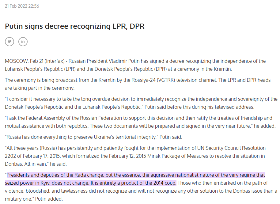 Despite the fact that the so-called “interim government”, didn’t last long and was followed by successive elected governments, in the propaganda line of Russia these governments are still illegitimate, tainted by the 2014 coup and still suffering a legitimacy crisis, with Russian officials and aggregators referring to the Ukrainian government as the “Kiev regime”.