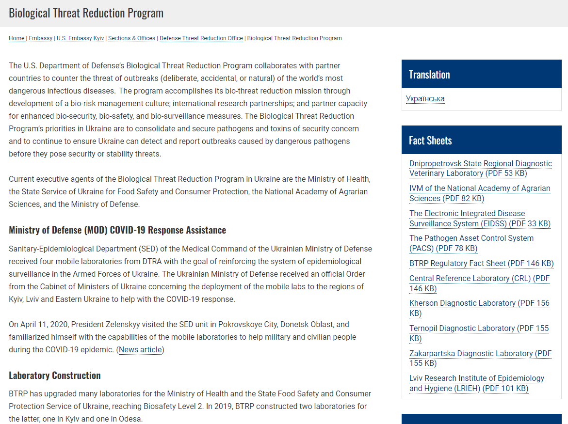 We checked the embassy website itself and here’s what we found, the biolabs and the documents do indeed exist, that much is true, but the claim that the embassy tried to delete them from their website is not, the embassy has a page specifically dedicated to their biological program in Ukraine, and the documents Dilyana mentioned are attached as PDFs on the side, labelled as “fact sheets”, when we clicked on the PDF links, they were all accessible and free to read, detailing the laboratories and the Pentagon’s involvement in them.