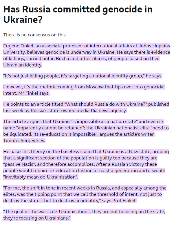 To justify these genocide allegations, some analysts point to Russia’s use of dehumanising language regarding Ukraine, branding an unspecified amount of the population as either “Nazis” or “brainwashed by Nazism”, using derogatory language like “Ukrop” to refer to Ukrainian people, and then connect this rhetoric to war crimes allegations, painting an image of a holocaust style systematic incitement and practice of destruction, but this ignores the fact that unfortunately, dehumanisation is an often used tactic in war, for obvious reasons, it’s easier to kill an enemy soldier if he’s less of a person to you, an “other”, a chess piece on the board to be knocked over.