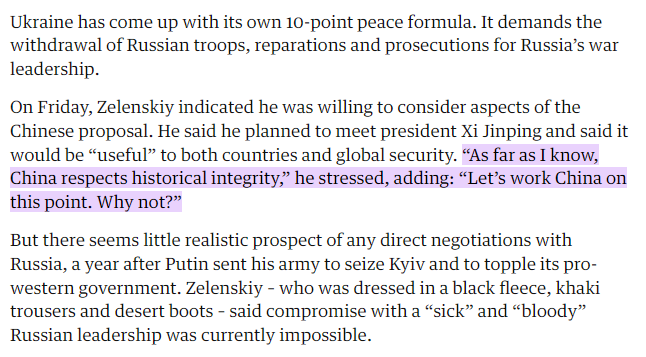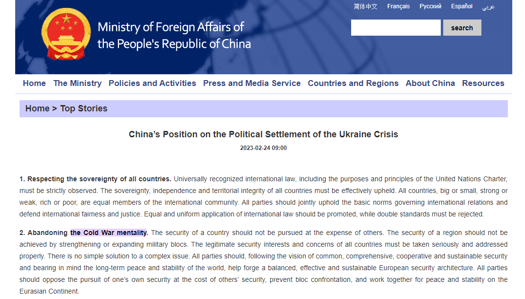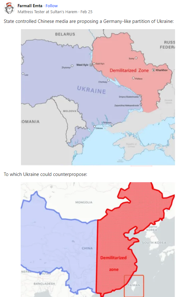 And if we look up China’s actual announcement of their Ukraine peace plan, it doesn’t include any sort of maps splitting Ukraine at all, it actually mentions the need to support “territorial integrity” for all countries, a fact that Ukraine’s President Zelensky noted shortly after the plan was announced, saying “China respects historical integrity, let’s work with China on this point, why not?”, the plan also specifically condemns the “cold war mentality”, further showing that the idea China is proposing a Cold War style division of Ukraine is nonsense.