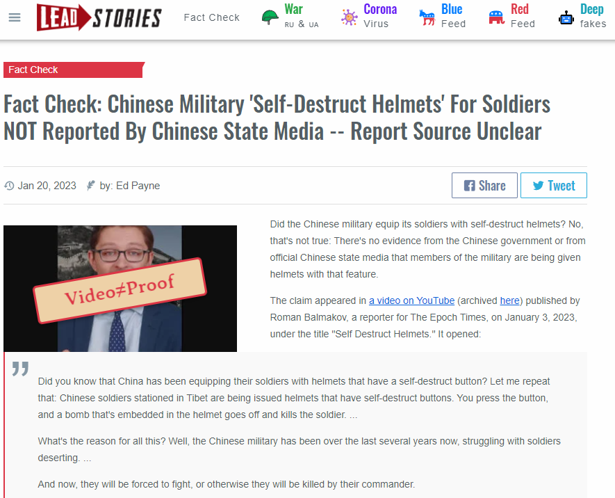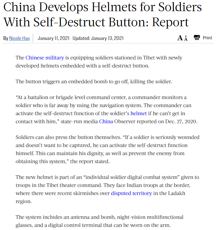 If we look at Roman’s video, he shows an article from the Epoch Times titled “China Develops Helmets for Soldiers With Self-Destruct Button: Report”, now we just have to follow the source chain to the end: