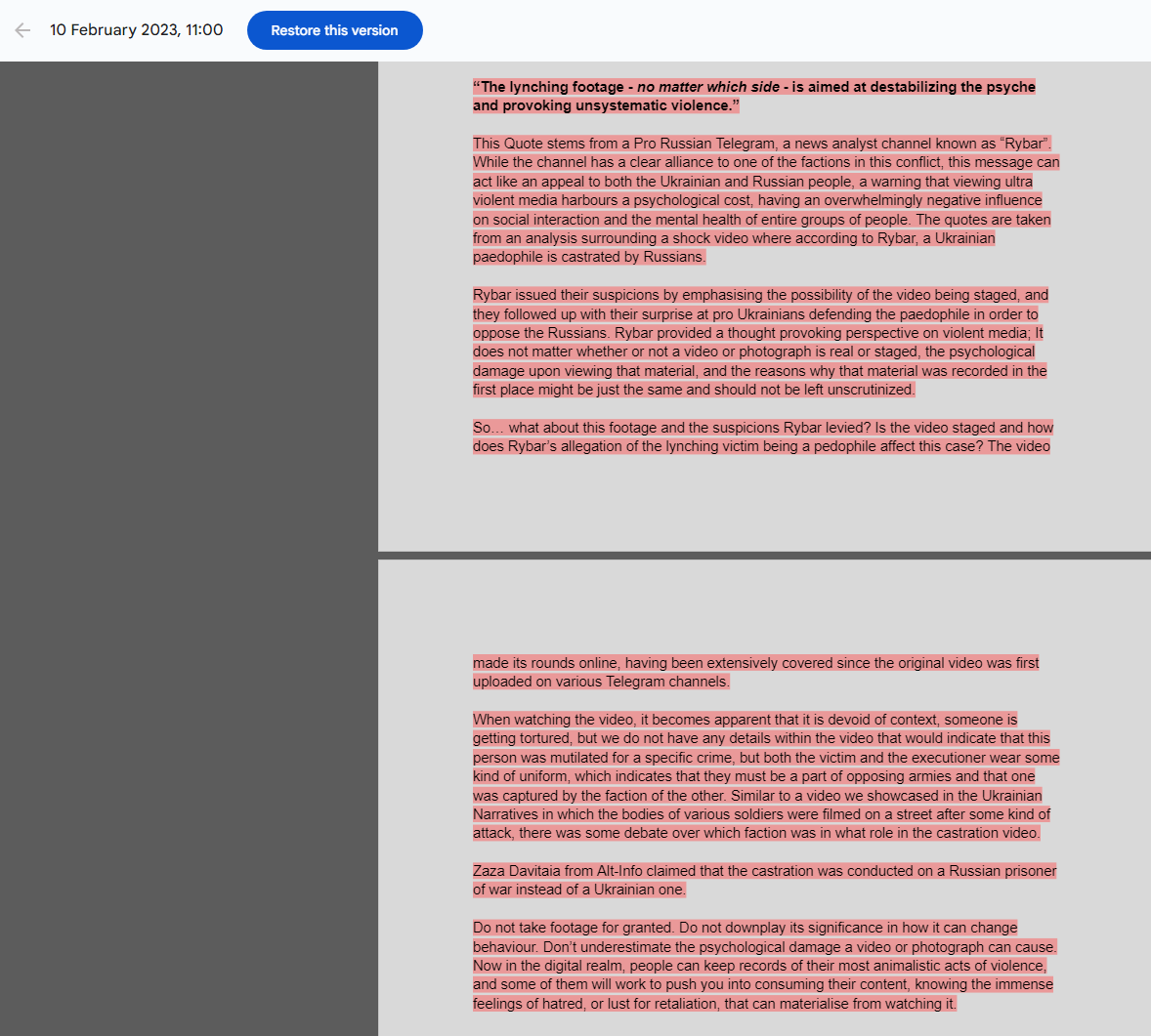 When watching the video, it becomes apparent that it is devoid of context, someone is getting tortured, but we do not have any details within the video that would indicate that this person was mutilated for a specific crime, but both the victim and the executioner wear some kind of military uniform, but similar to a video we showcased in the Ukrainian Narratives in which the bodies of various soldiers were filmed on a street after some kind of attack, there was some debate over which faction was in what role in the castration video.